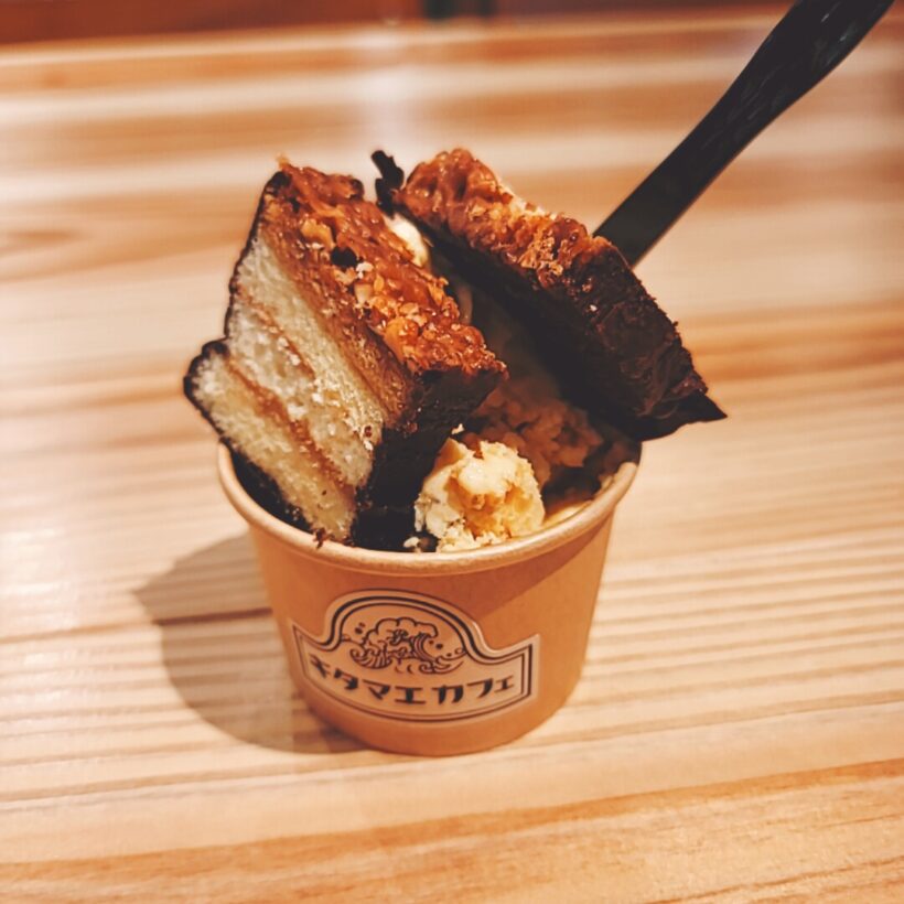 ベースとなるバニラアイスにもプラリネがしっかり混ぜこまれており、ひと口ひと口でその美味しさが堪能できます。カステラの食感が良い……!