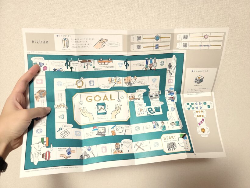 タンザナイトが鉱山で発掘されてからジュエリーとして人の手に渡るまでを追ったすごろくになっています。緩くてオシャレなイラストいいな〜!