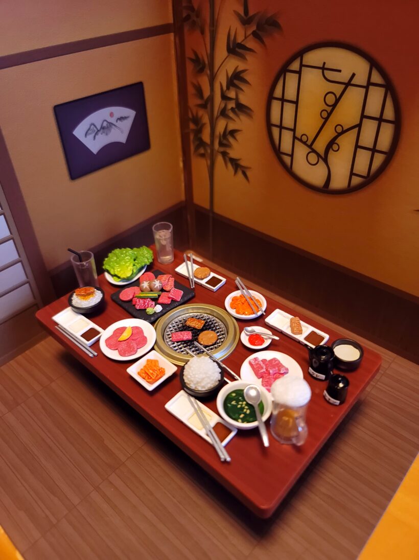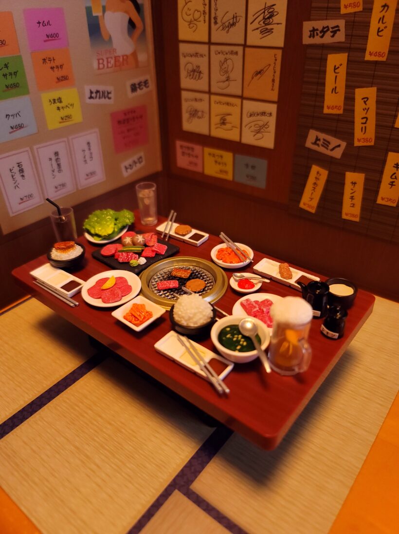 焼肉屋さんのミニチュアフードセット「じゅうじゅう苑」だそうな……。背景も含めてぜーんぶセットで入ってます。