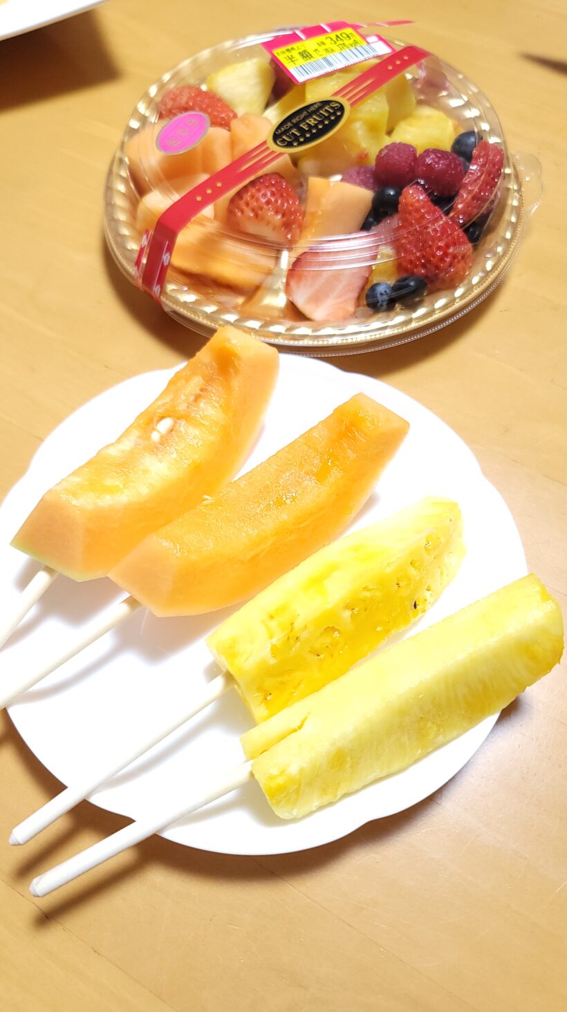 家族でたべるために買ってきたけど、誰も食べないのをいいことに棒に刺さった方のパインは2本とも私が食べました。
