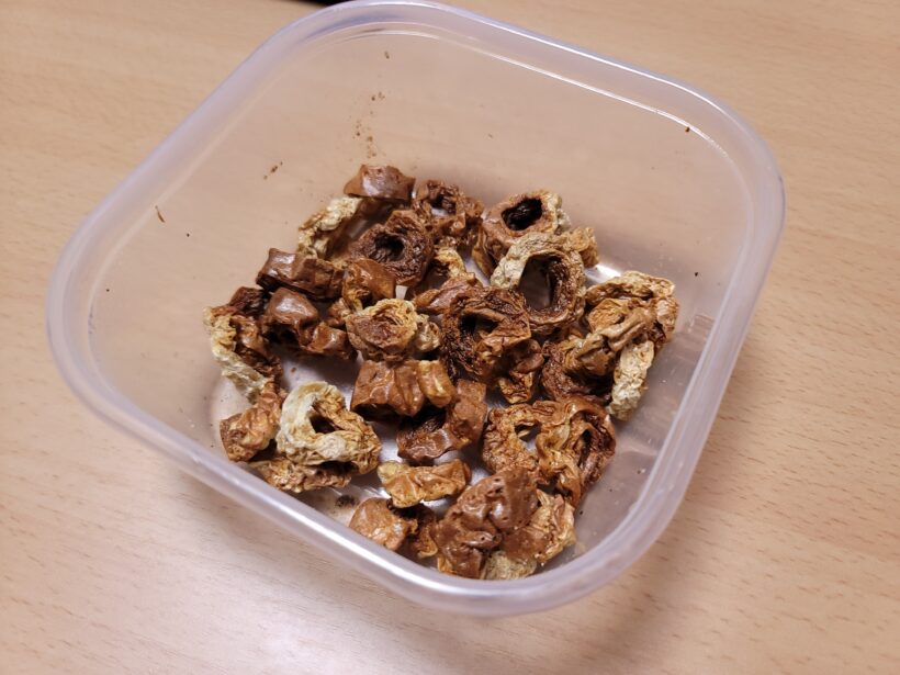 チンし終わった直後はびっっっっくりするほどちくわがふくらんでいるのですが直ぐに萎んでこんな感じの木片になります。