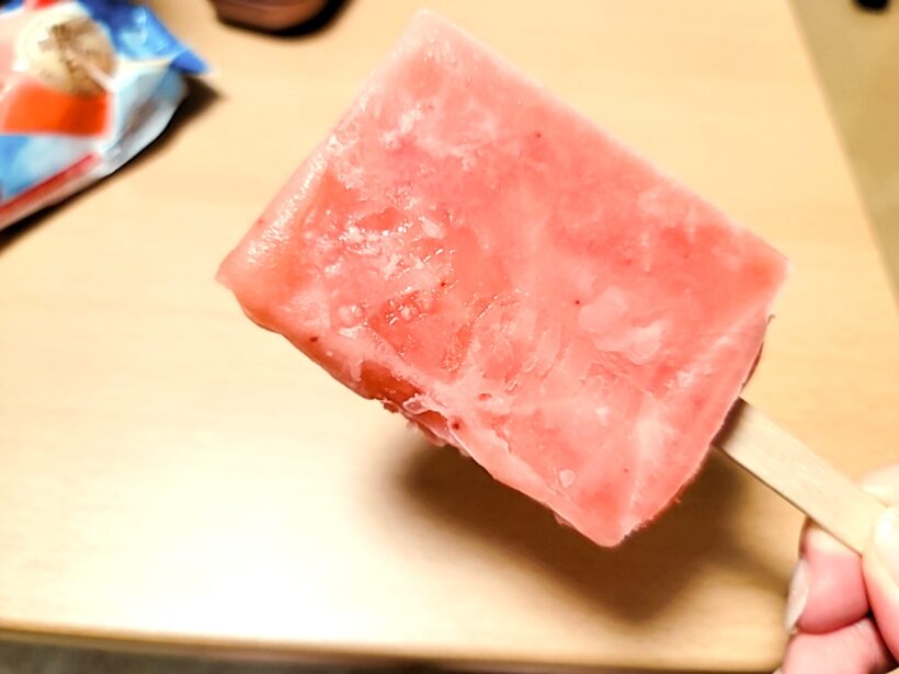 いかにもいちご!って感じの鮮やかな色の通り、いちごの果実っぽさがやたら強いアイスキャンデーで最高でした。
