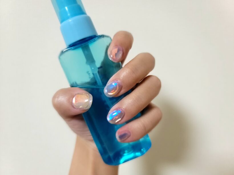 ジェルの間にセリアのネイル用オーロラフィルムシールを挟んでぷっくりと閉じ込めているのですが、これがとにかく面倒で面倒で!!笑