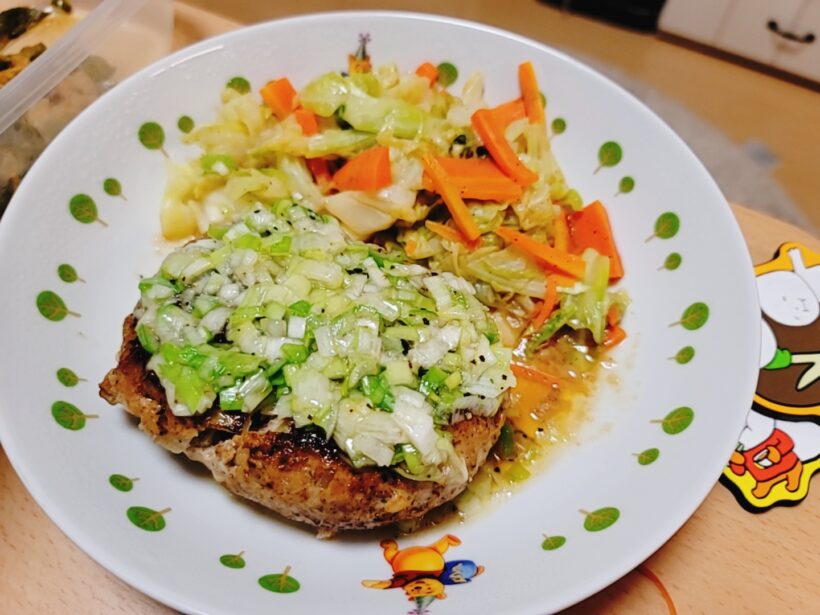 今日のお夕飯は自分の食欲に任せてがっつりねぎ塩ハンバーグを作りました。