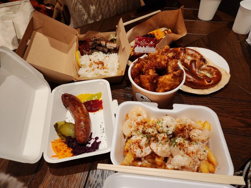 バスセンターのところで開催されているクリスマスマーケットでガーリックシュリンプポテトやらソーセージやらをたべ、