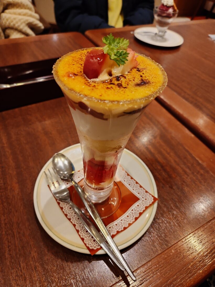 最後にはロイホで〆としてリンゴのブリュレパフェを食べてフィニッシュ……!