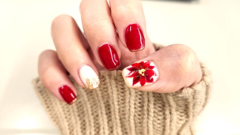 赤と金とポインセチアのキラキラクリスマスネイル!