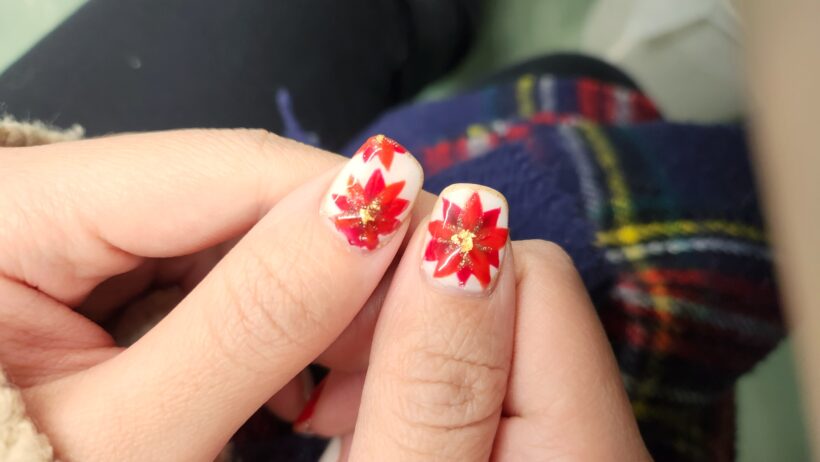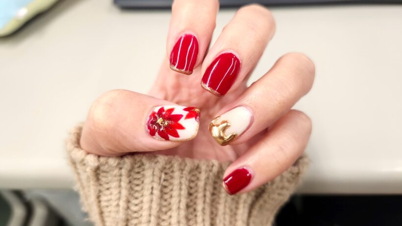 大雪で完全にテンションが死んでますが、今週は爪がハッピークリスマスでゴキゲンなデザインになっていました。