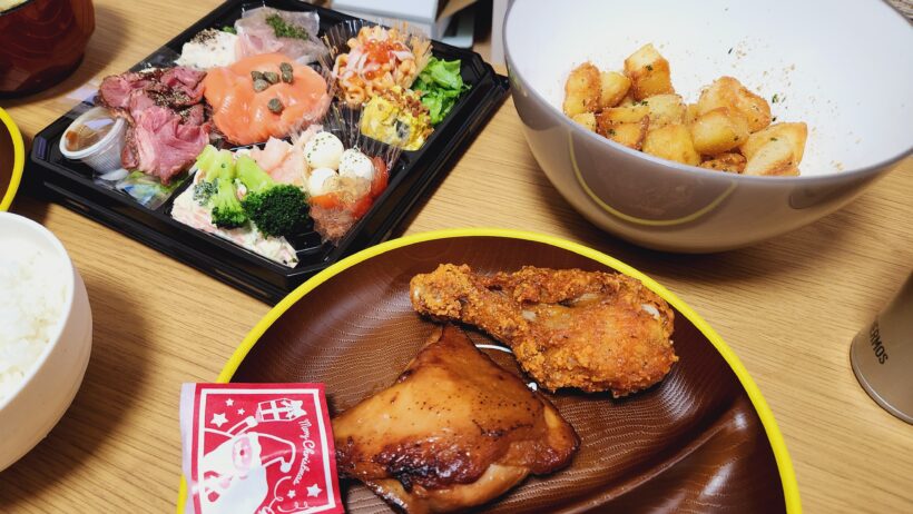 フライドチキンとローストチキンの6本セットとサラダオードブルはファミマで予約して、ポテトは自分で揚げちゃいました!