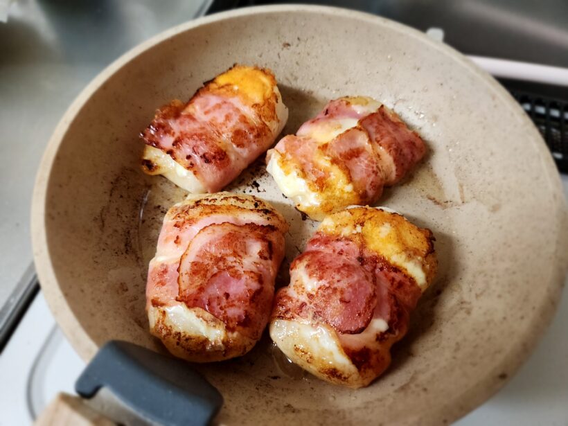 焦げたチーズとベーコンのしょっぱさのおかげで箸が進む!フライパンを使うのでちょっとめんどくさいのですが、手間をかけるだけの価値がありました。