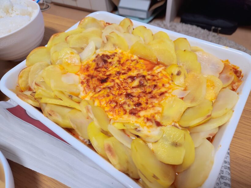 こちらはB5サイズくらいの皿いっぱいのポテトミートグラタン。本来はもう少し小さい器でやるレシピなのですが、ちょうどいいお皿がなかったのとレシピ以外の野菜も入れたかったのとでこんなことに……。