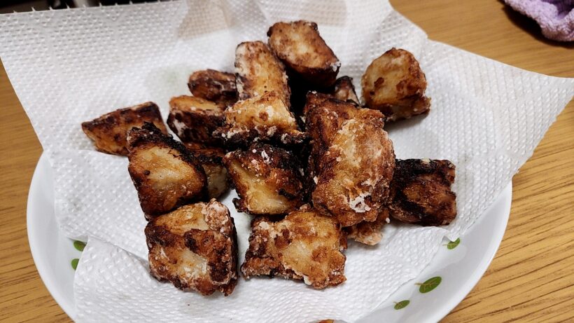 一応しっかりと下味の調味液につけてはいたのですが、さすがに里芋なので鳥の唐揚げほどの味の濃さにはならず。