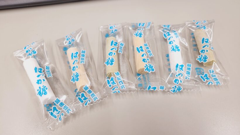 テレワーク中は当然いただく機会がなかったため、おそらく約2年ぶりのはっか糖。前は和紙っぽい質感の個包装かつ1本がこれの3つ分くらいの長さでした。