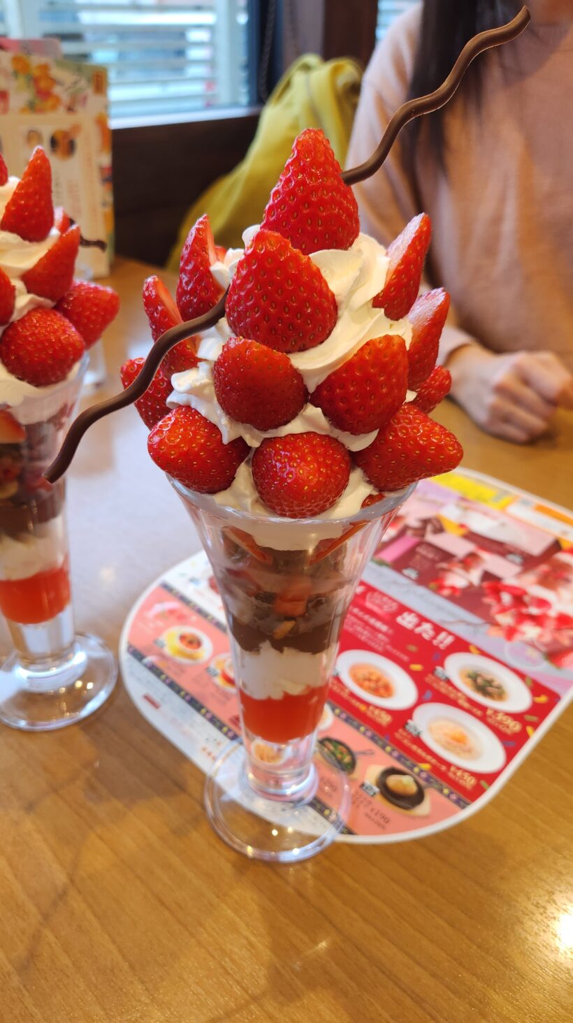 イチゴに目がない妹に誘われて、母と妹と3人でココスの期間限定いちごパフェを食べに行きました。
