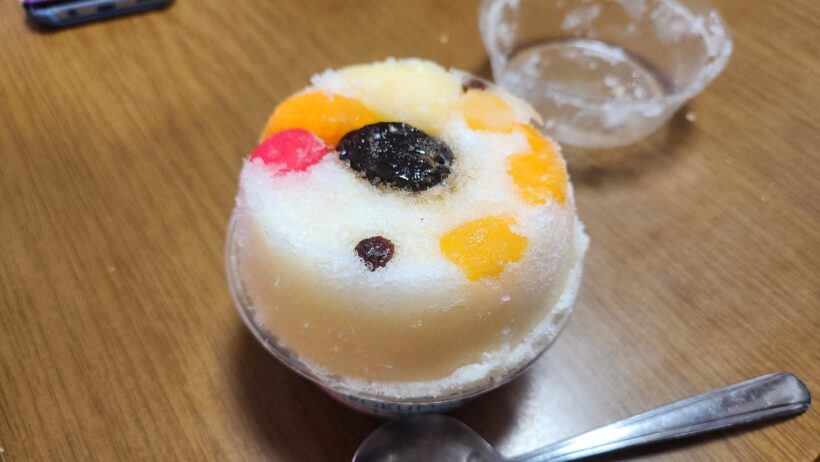 ガチガチに固まってるとかき氷が全然すくえなくてまわりがびしゃびしゃになるので、少し放置してから食べました。