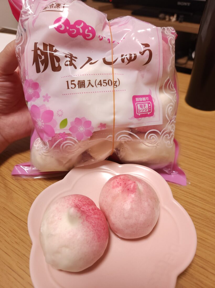 レンチンしすぎると底面が固くなったりあんこがカリカリ?になったりしてしまいますが、上手く温められれば程よいふわもち食感の桃まんじゅうが楽しめます。