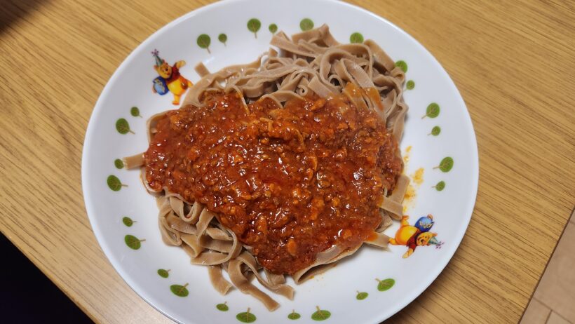 麺はめちゃめちゃ茶色で、茹でてボロネーゼソースをかけた状態はパスタと言うよりみかづきのイタリアンでした笑