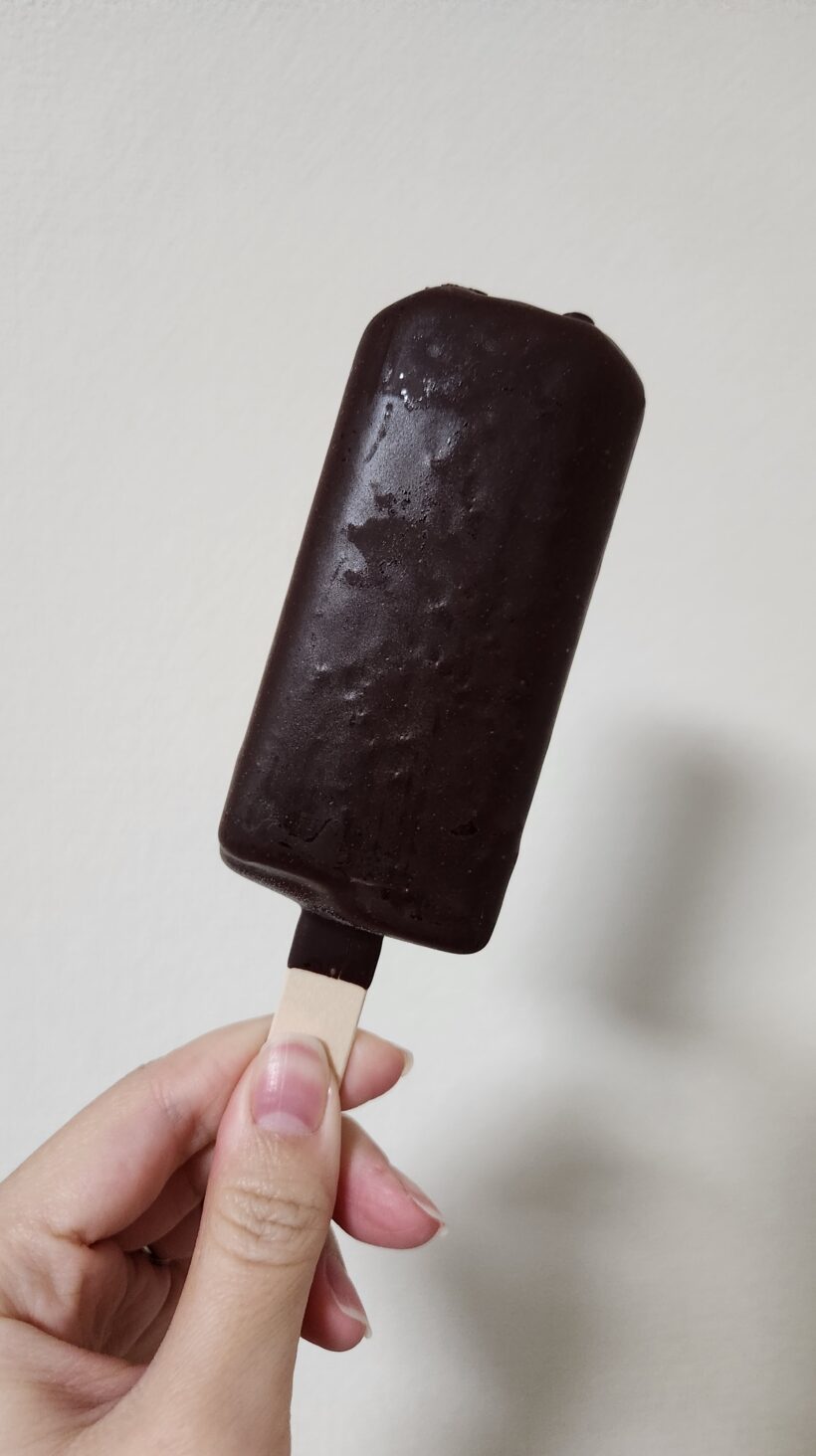 表面はつやつや真っ黒。なんとなく安いチョココーティングアイスとはテクスチャが違う気がします。