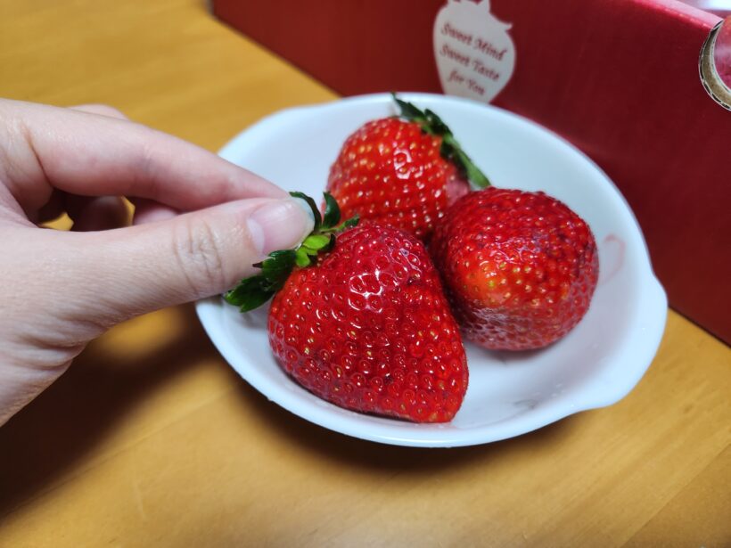 わたしはとちおとめのほうを1パック貰ったんですが、大きいのに甘さがボヤけずしっかりしていてとびきりの満足感でした。