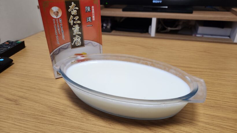 スーパーに売っていた陳建一シェフの杏仁豆腐の素です。いい器が無いのでグラタン用のガラス皿にギリギリまで流し込みました。パッと見は大きさが分かりづらいけど実物はかなり大盛りです笑