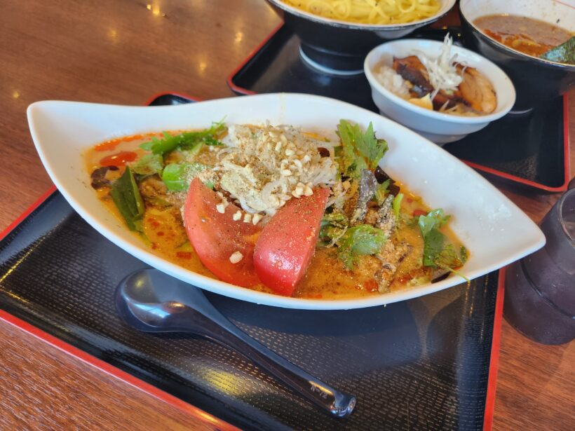 不思議な形のお皿に入って運ばれてきた時の輝きよ……!冷やし坦々麺自体あまりお店で食べたことがないんですけど、トマトがのってるやつは初めて食べたので新鮮でした。