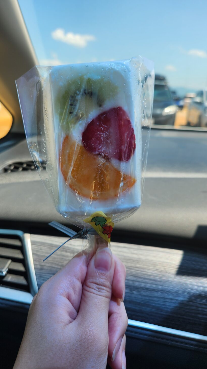 ヤスダヨーグルトをベースにしたアイスキャンディーに薄切りフルーツが埋め込まれていて甘酸っぱ美味い!