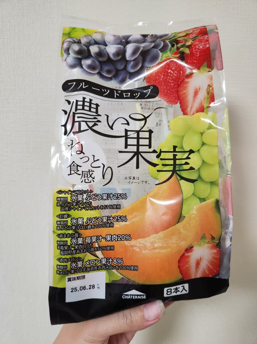 フルーツ果汁がしっかり入ったアイスで、1口サイズの棒アイスが8個入って240円くらい。