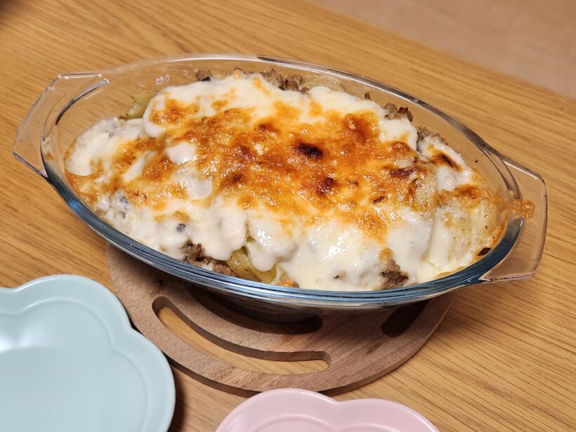 ホクホクじゃがいもにホワイトソースとミートソースどちらも合う!ひき肉ときのことじゃがいもだと思うと当然間違いない組み合わせなんですよね。