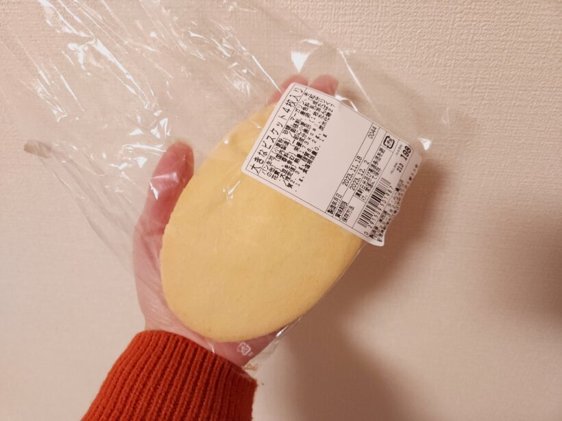 こちら、名前は「大きなビスケット」だそうで、その名の通り手のひらサイズのでっかくて薄めのビスケットが3枚入ってました。(値札は4枚になってるけど他の奴もみんな3枚入りだったので表記がミスってる模様)