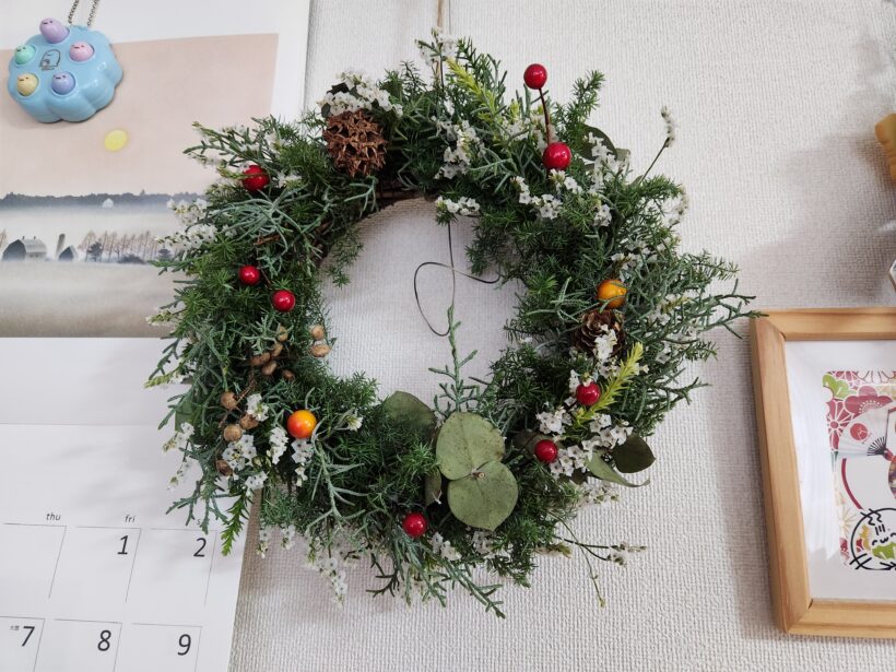 植物の種類が一般的なリースとちょっと違うのでなんだかボタニカルな雰囲気がいいですよね。