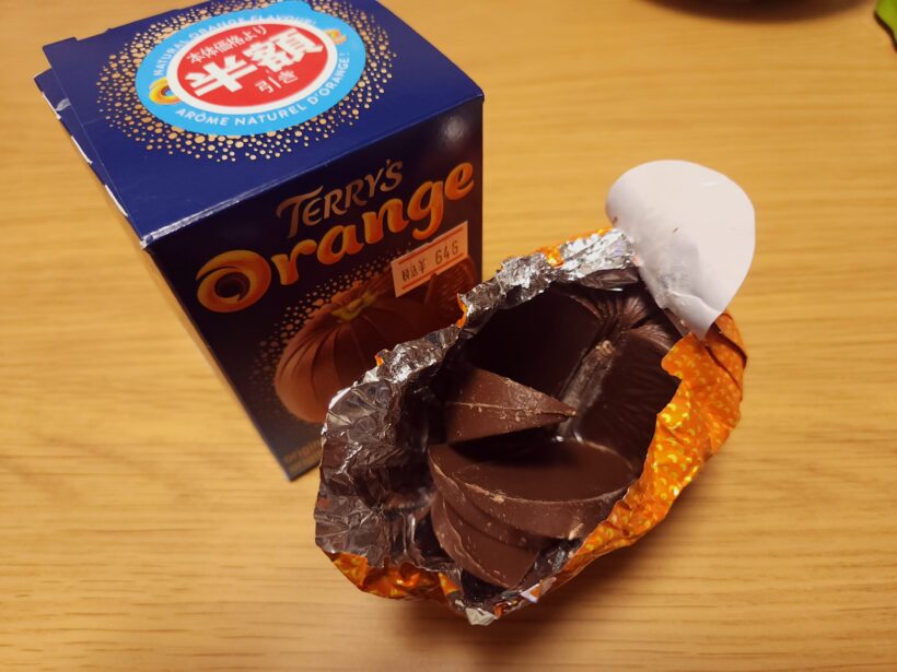 近所のウェルシア、硬いところにたたきつけてから食べる輸入菓子のオレンジチョコレートが半額でした。(※衝撃を加えるとちょうど食べやすいサイズに等分される作りになってるチョコです)