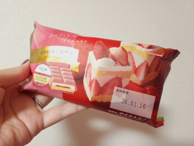 いちごショートケーキ風のモナカアイス!パッケージがいかにも美味しそうでいいですね。