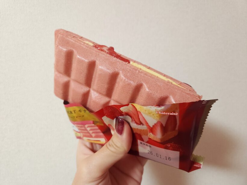 案外いちごチョコのモナカアイスってないので、いちごチョコ好きな人には嬉しいアイスですよね。