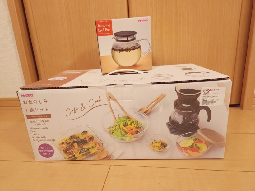 HARIOのお楽しみ7点セットと、耐熱ガラスのティーポットです。