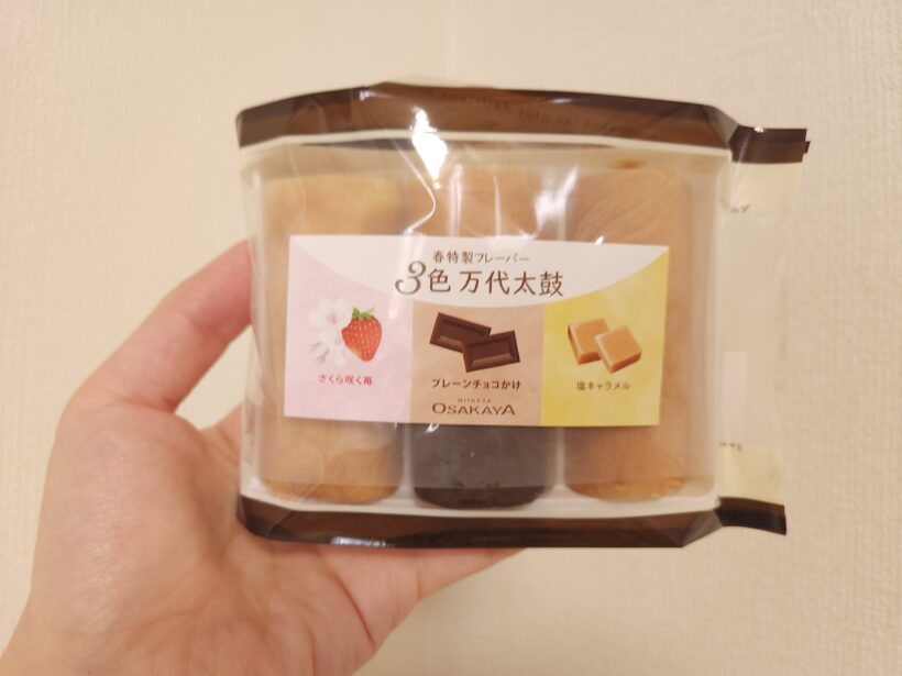 この春の限定らしい「3色万代太鼓」、真ん中のプレーンチョコがけが1番美味しくてェ⋯⋯。