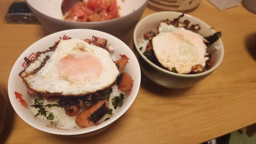 香熏のウインナーと家に唯一あった韓国のり、カリカリに焼いた半熟目玉焼きと美味しいもの全部のせ。