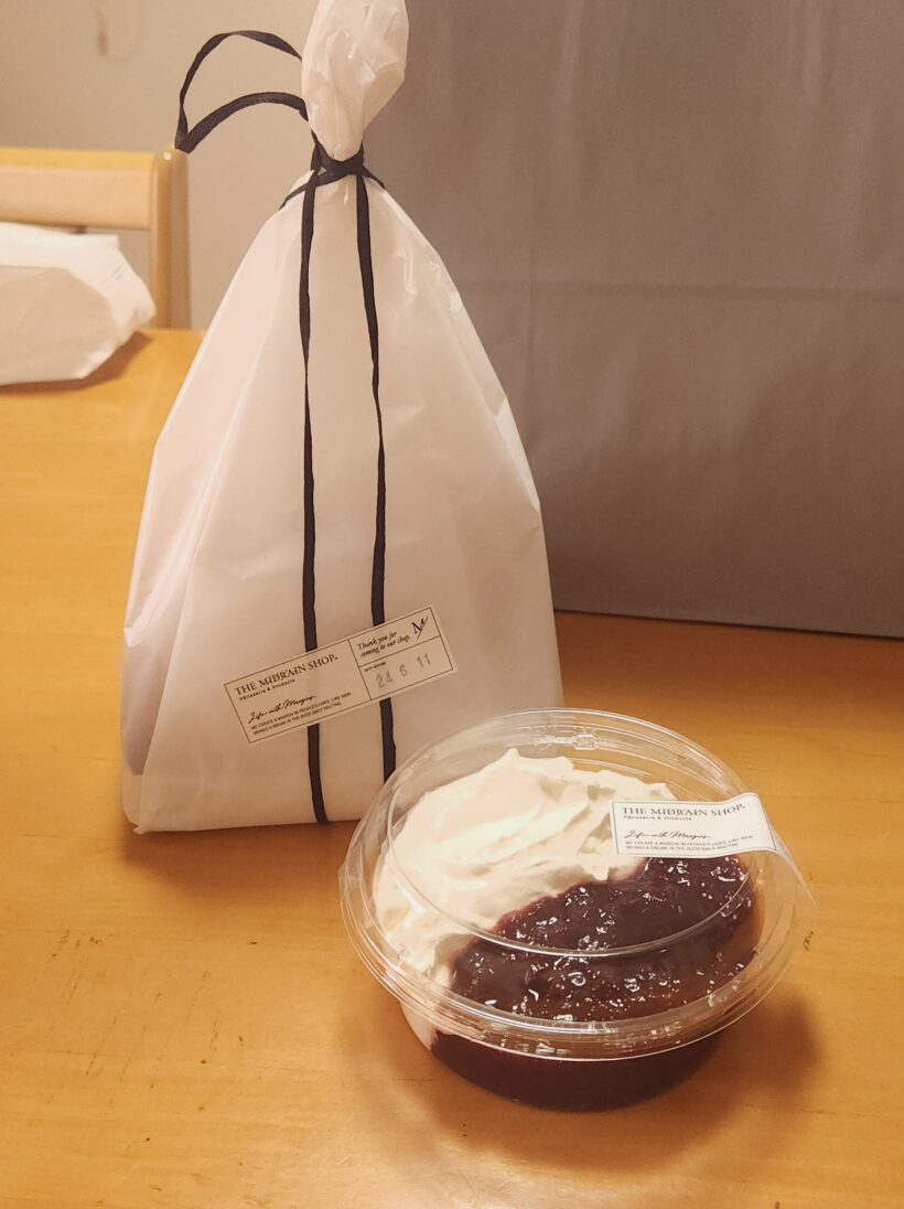 単体だとちょっと喉につまるところもありますが、500円で買える生クリームとイチゴのコンフィのセットをたっぷりのせたらさらに別の美味しさも楽しめます。