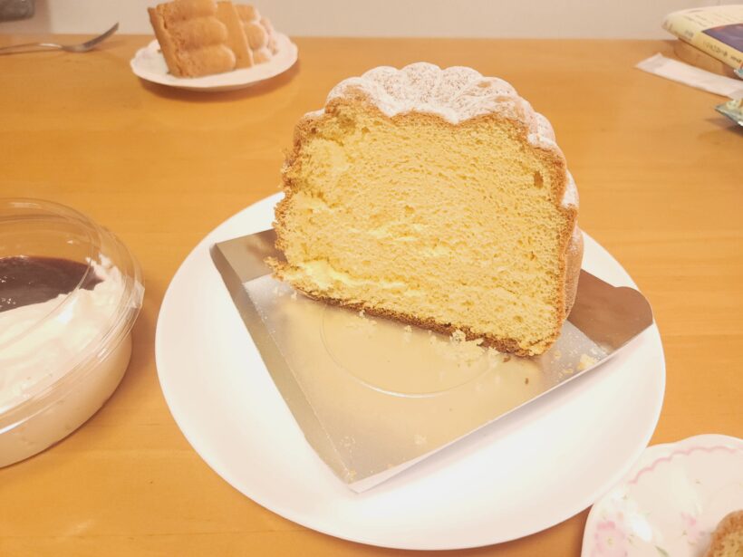 シフォンケーキとカステラの中間みたいなお菓子ということですが、どちらかと言うと表面がサックサクのシフォンケーキ。