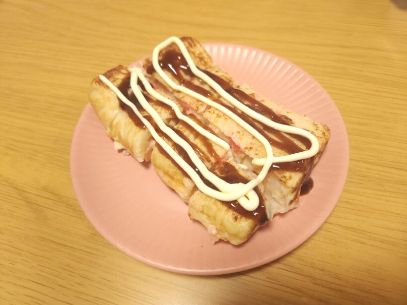 卵焼き器に生地を流して2つ折りにしたらもう完成!というらくちんな所がいいですね。たこ焼き器を使った方が楽しいけどあれは片付けが大変だからね。