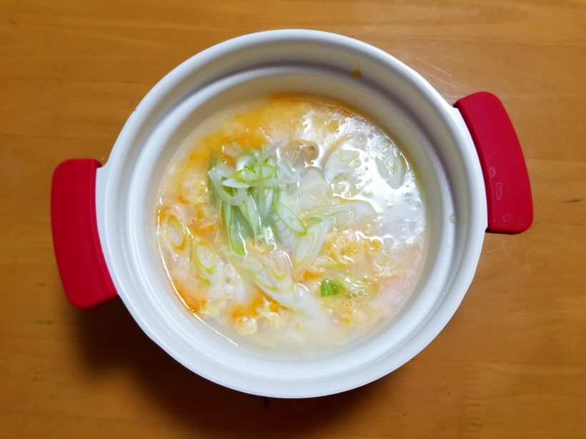 夕ご飯は生姜とネギと卵の中華鶏がゆでした。美味しい……半熟卵っぽいのもまた最高……