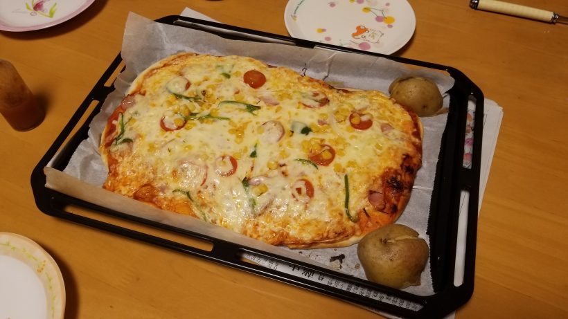 本来一斤の食パンを作るために発酵させられていた生地でしたが、薄く延ばして具材をのせてオーブンで焼けばピザとしてなんとか食べられるということが証明されました。