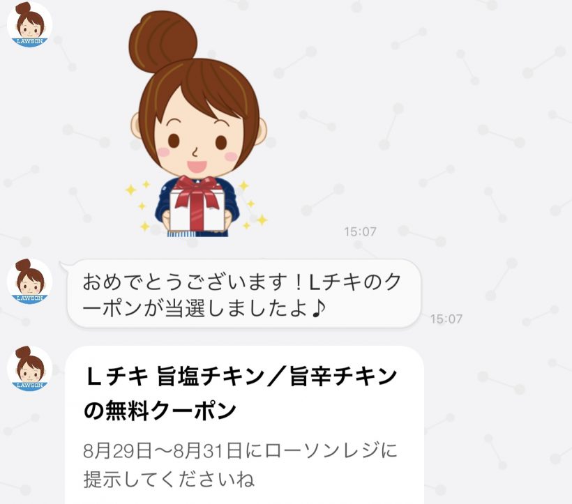 LINEのローソンさんのアカウントで、Lチキ当たりました!