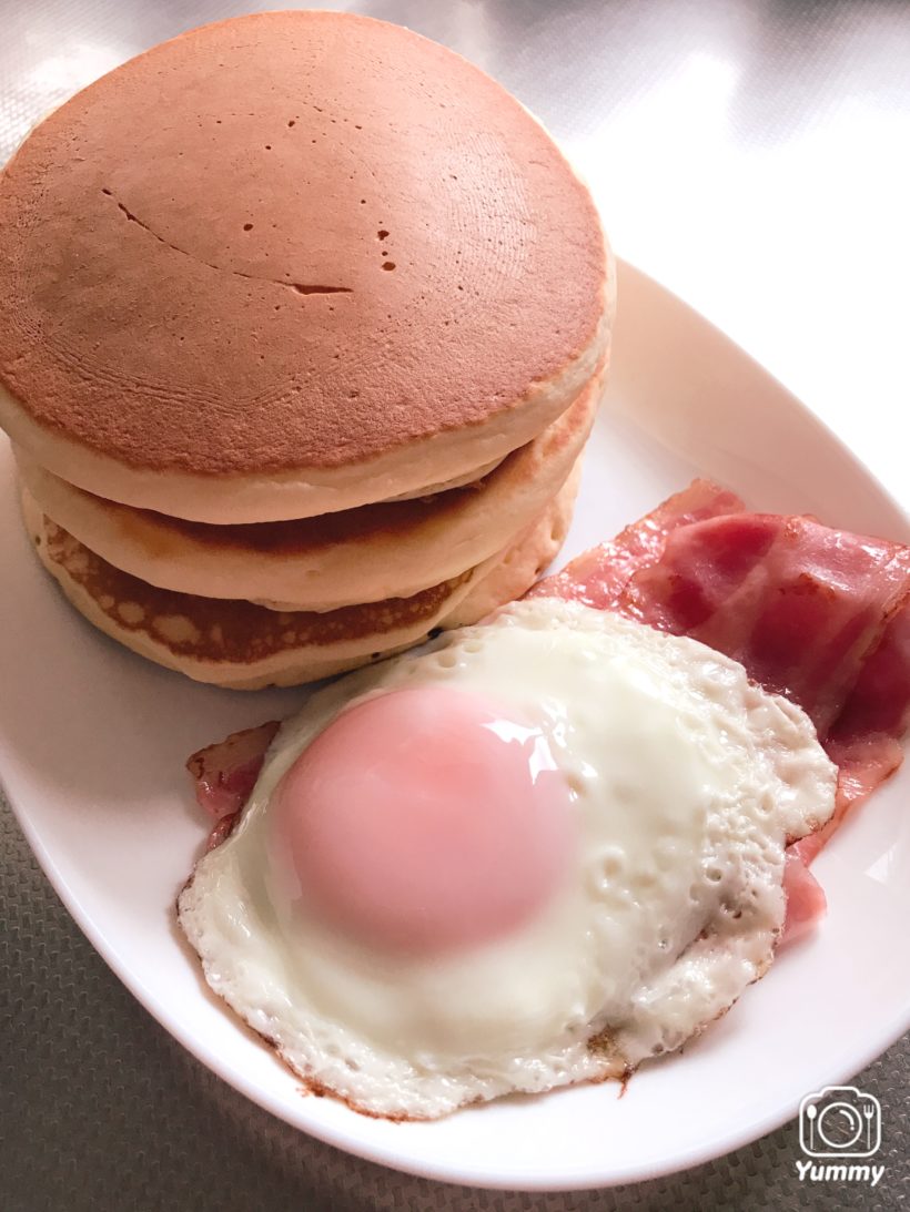 お昼ご飯で、作ったのであまじょっぱいベーコンと目玉焼きバージョンです。