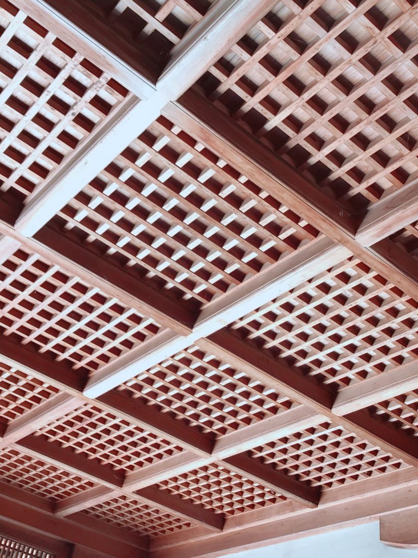 格子の細工が美しい玄関の天井