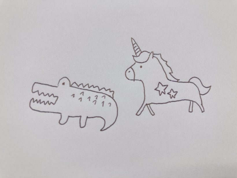 絵心ないなりに画像見て描いた、ワニとユニコーンです。