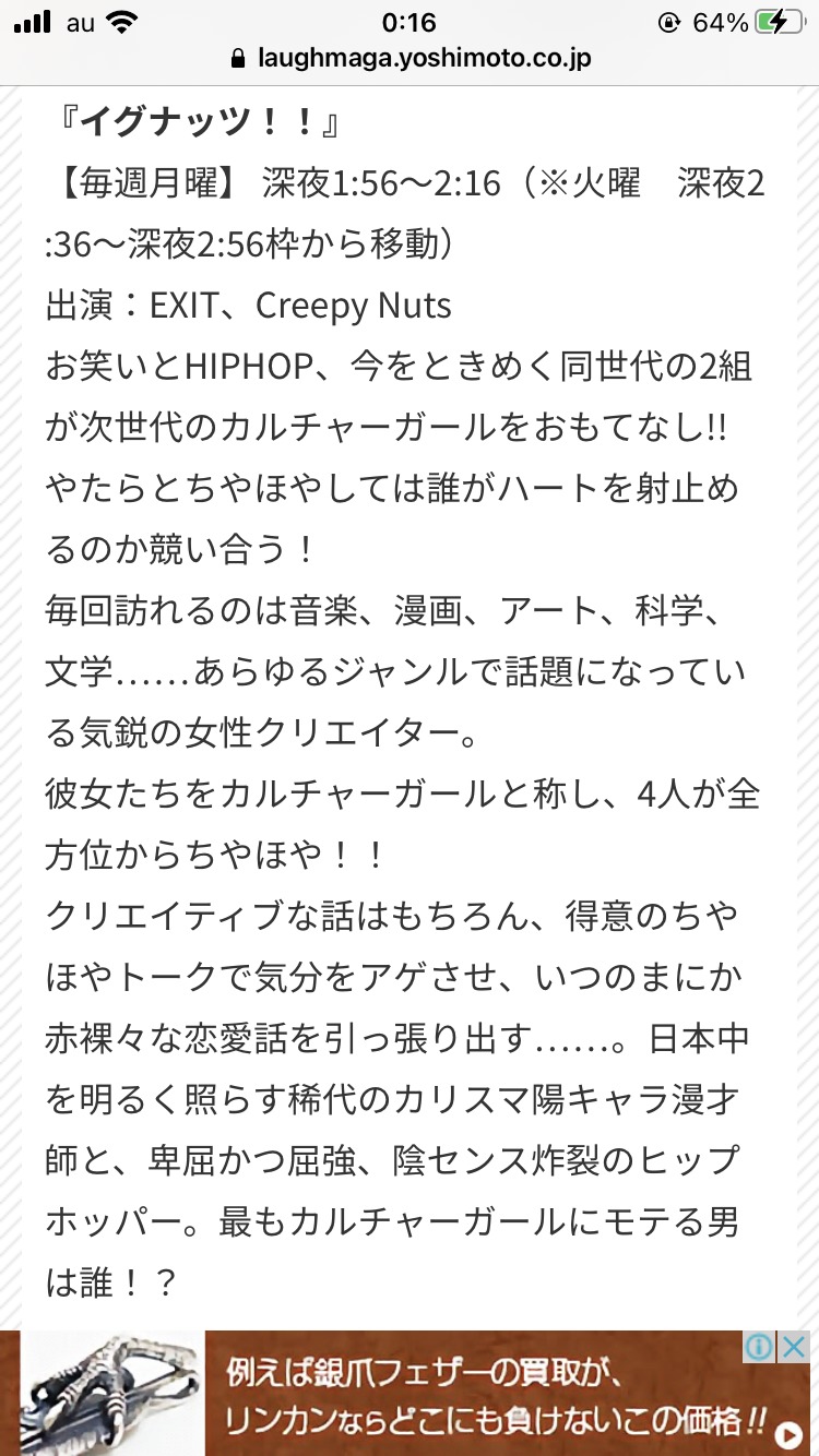 9月といえば番組編成期なわけですが、私の推しであるEXITが出演している番組も例外ではなく、テレ朝の深夜枠で放送中(新潟だと日曜11:30〜週遅れで放送中)のCreepy Nutsとのトーク番組『イグナッツ!!』も、放送時間が一つ繰り上がり、放送曜日と番組内容も今までとガラッと変わるわけなのですが•••。