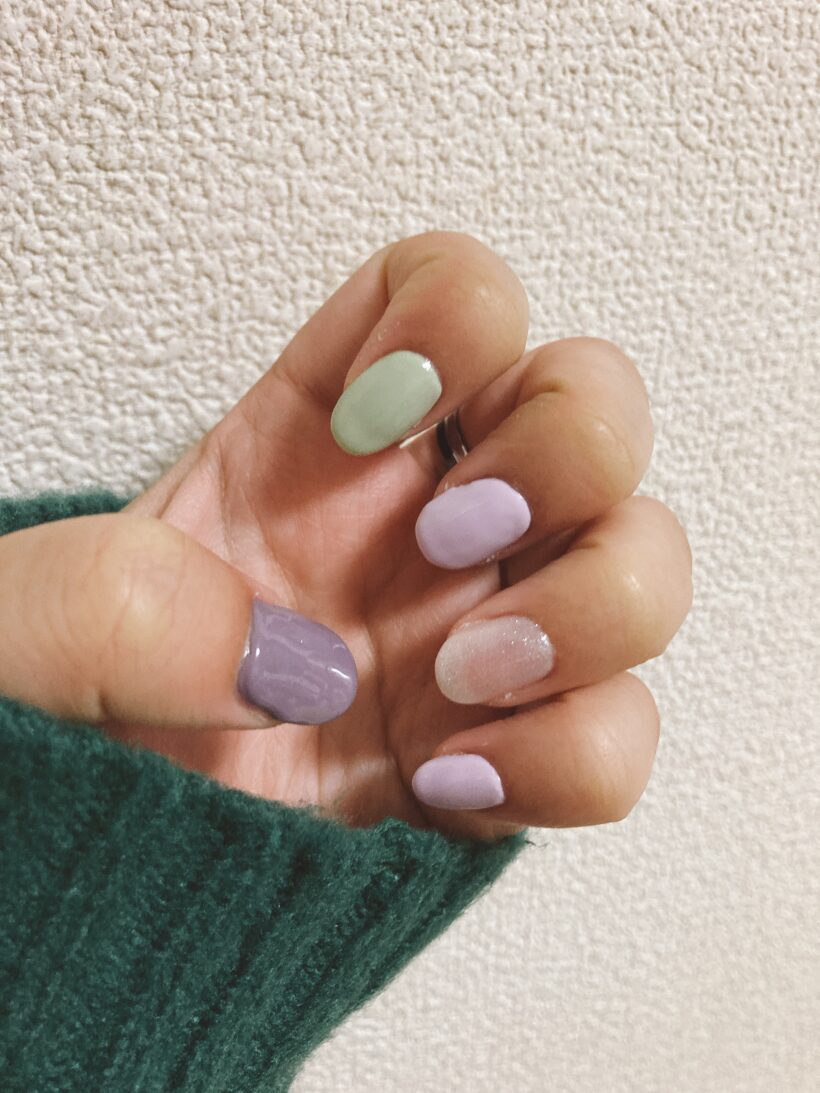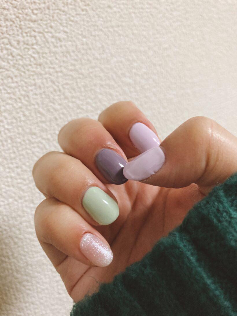 自分だったらまず選ばない色ばかりなので、すごく新鮮!意外としっくりくるもんですね〜。特に左手薬指・右手小指の白ラメがめちゃくちゃ可愛い!今の時期に人気のカラーなだけあるなと。