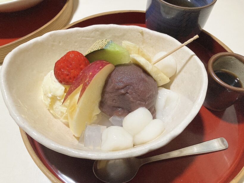 白玉がもっちもち&コシがあってめちゃめちゃ美味しい!あんこも甘さ控えめで食べやすかったです。フルーツも美味しかった〜。
