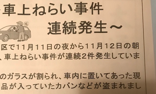 回覧板に「車上ねらい事件連続発生」のチラシが。