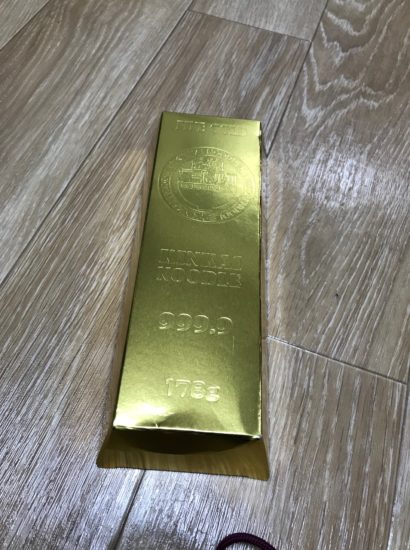 妻が忘年会でもらってきた金のパッケージの変わった商品です。